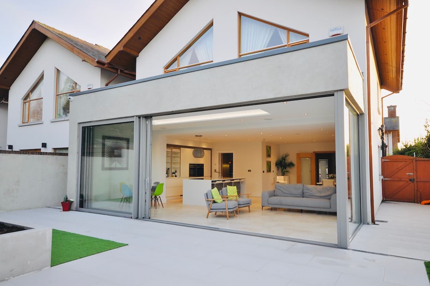 A modest extension to a detached house in Malahide, opening the ground floor to the garden through full-width glazing. The brief called for integrating the garden as a visual and practical asset to the kitchen, living and dining space to the rear.